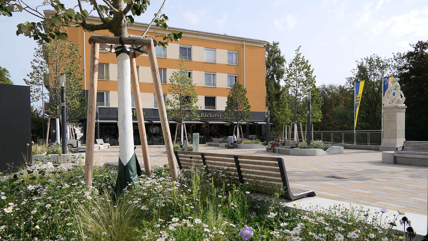 Die natürlichen Funktionen des Bodens werden durch die Entsiegelung und einer Umgestaltung mit Pflasterung, Rasengittersteinen, wassergebundenen Decken sowie Grün- und Wasserflächen weitestgehend wiederhergestellt. An Hitzetagen bedeutet das eine kühlere Umgebung, insbesondere bei einer klimafitten Bepflanzung. Bei Starkregenereignissen kann Regenwasser versickern, statt die Kanalisation zu belasten.